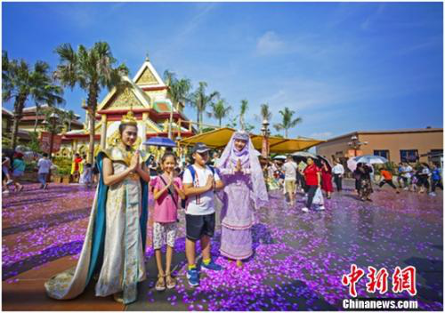 據(jù)介紹,方特東盟神畫(huà)讓游客不出國(guó)門(mén),一站式“打卡”東盟十國(guó)。其中,《相約下龍灣》以參觀越南郵票展的形式,游客通過(guò)無(wú)軌跡尋跡游覽車跟隨主角一起感受當(dāng)?shù)靥厣霞小⒚麆俟袍E;《塔鑾盛典》則運(yùn)用360度巨型環(huán)幕呈現(xiàn)了老撾象征千年塔鑾寺的建設(shè)歷程和歷史變遷;《千島之歌》主要以程控魔球、魔幻舞臺(tái)和經(jīng)典演藝等形式,為游客呈現(xiàn)印度尼西亞獨(dú)有的節(jié)慶文化和民俗風(fēng)情;《馬六甲勇士》通過(guò)大型漂流河道、水幕電影、海嘯災(zāi)難模擬、虛實(shí)場(chǎng)景相結(jié)合,為游客講述了馬來(lái)西亞民族英雄漢都亞大戰(zhàn)海盜的傳奇故事。
