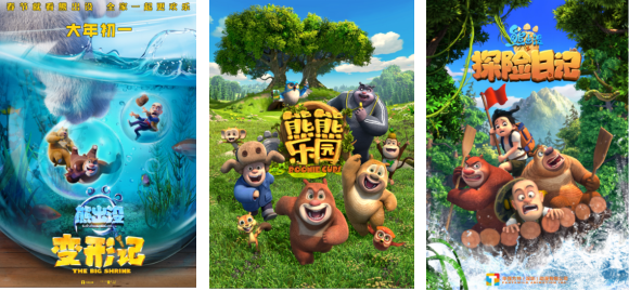 左-動(dòng)畫電影《熊出沒(méi)?變形記》,中-動(dòng)畫片《熊熊樂(lè)園》,右-動(dòng)畫片《熊出沒(méi)之探險(xiǎn)日記》