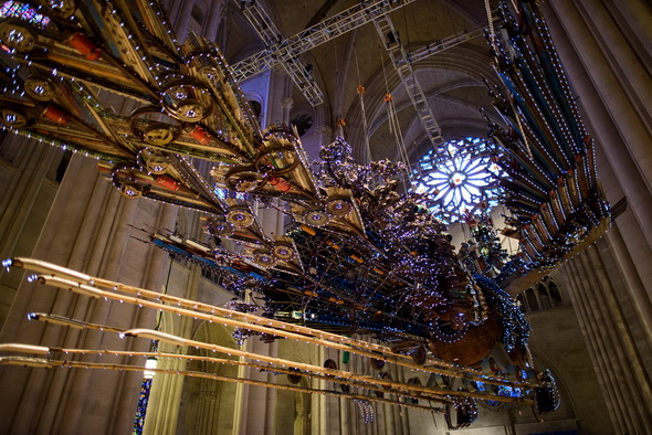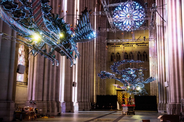 制作完成后,徐冰選擇在紐約哥倫比亞大學(xué)對面的圣約翰主教堂中展示自己的作品。大家知道,鳳凰涅槃是中國關(guān)于生命重生的故事,教堂則是西方生命重生之地,這只鳳凰上面用了一些五彩斑斕的霓虹燈,這是當(dāng)代的商業(yè)文化元素,鋼鐵是西方工業(yè)革命的元素,但作品的文化內(nèi)核卻是中國的。