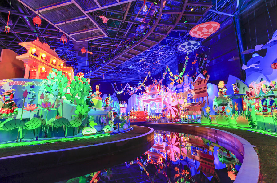 視覺上,《繽紛華夏》以色彩絢爛、充滿童趣的道具進(jìn)行裝點(diǎn),深受孩子們的歡迎。在體驗(yàn)這個項(xiàng)目時,游客們將乘坐漂流船欣賞水道兩邊各民族的獨(dú)特風(fēng)情。隨著漂流船的行進(jìn),游客將看到許多造型可愛的機(jī)器人,它們身著維吾爾族、柯爾克孜族、哈薩克族、羌族等民族的傳統(tǒng)服飾,通過特別設(shè)計(jì)的歌舞,不斷演繹各民族的特色文化。