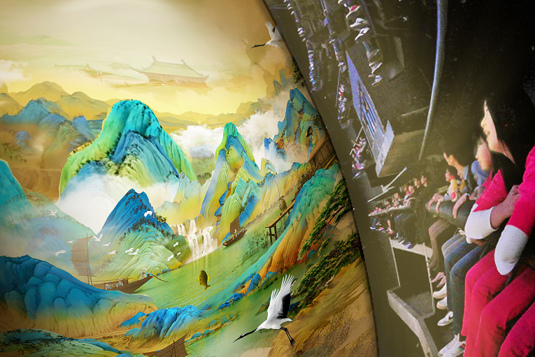 其中,最受廣大教師歡迎的項目當屬華強方特最新的匠心巨作《飛越千里江山》,該項目以國寶《千里江山圖》為藍本,通過方特獨創“飛行觀畫”模式,在4K分辨率的巨型高清球幕前,游客仿佛“飛入”畫中,身臨其境領略北宋傳世名畫的風采。全新的視角與逼真的畫面,短短幾分鐘的體驗讓老師們大呼過癮。