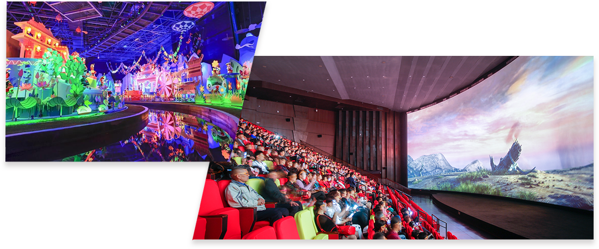 在文化高科技主題樂園板塊,華強(qiáng)方特成功實(shí)現(xiàn)了規(guī)模化發(fā)展和全國(guó)性布局,先后在全國(guó)20余座城市建成運(yùn)營(yíng)30余座主題樂園,成功打造了“方特東方神畫” “方特東方欲曉”“方特歡樂世界”“方特水上樂園” “方特東盟神畫”“方特絲路神畫”“方特國(guó)色春秋”“方特恐龍王國(guó)”“方特?狂野大陸”“熊出沒歡樂港灣”“熊出沒樂園”等十多個(gè)主題鮮明、風(fēng)格多樣、體驗(yàn)豐富的主題樂園品牌,弘揚(yáng)了中華民族精神和中國(guó)歷史文化的主旋律,形成文化樣板與示范效應(yīng),產(chǎn)生巨大社會(huì)效益,成為各地文化旅游支柱和特色文化旅游品牌。其中,蕪湖方特旅游度假區(qū)榮膺國(guó)家5A級(jí)旅游景區(qū)。華強(qiáng)方特在主題樂園領(lǐng)域持續(xù)創(chuàng)新,獲得了業(yè)界與游客的大力追捧與交口稱贊,多次攬獲 “摩天獎(jiǎng)”、 IAAPA"銅環(huán)獎(jiǎng)"等行業(yè)重量級(jí)獎(jiǎng)項(xiàng)。