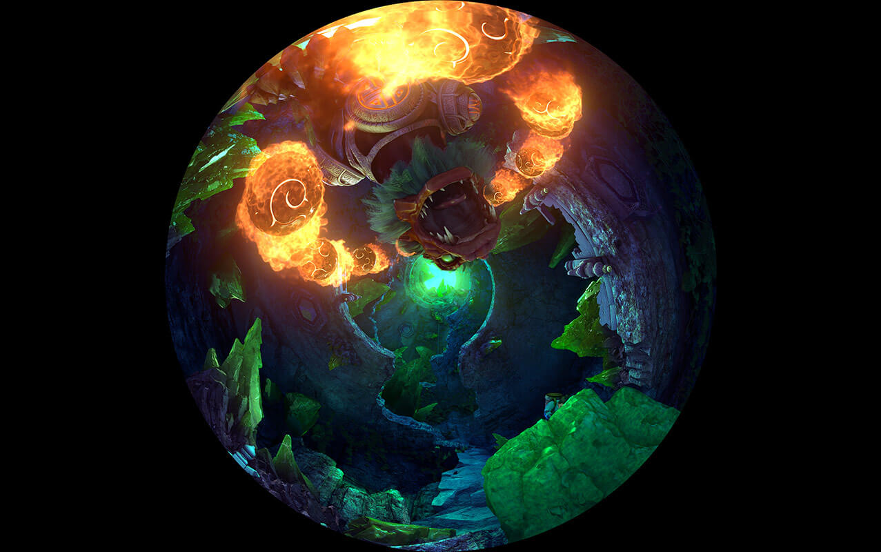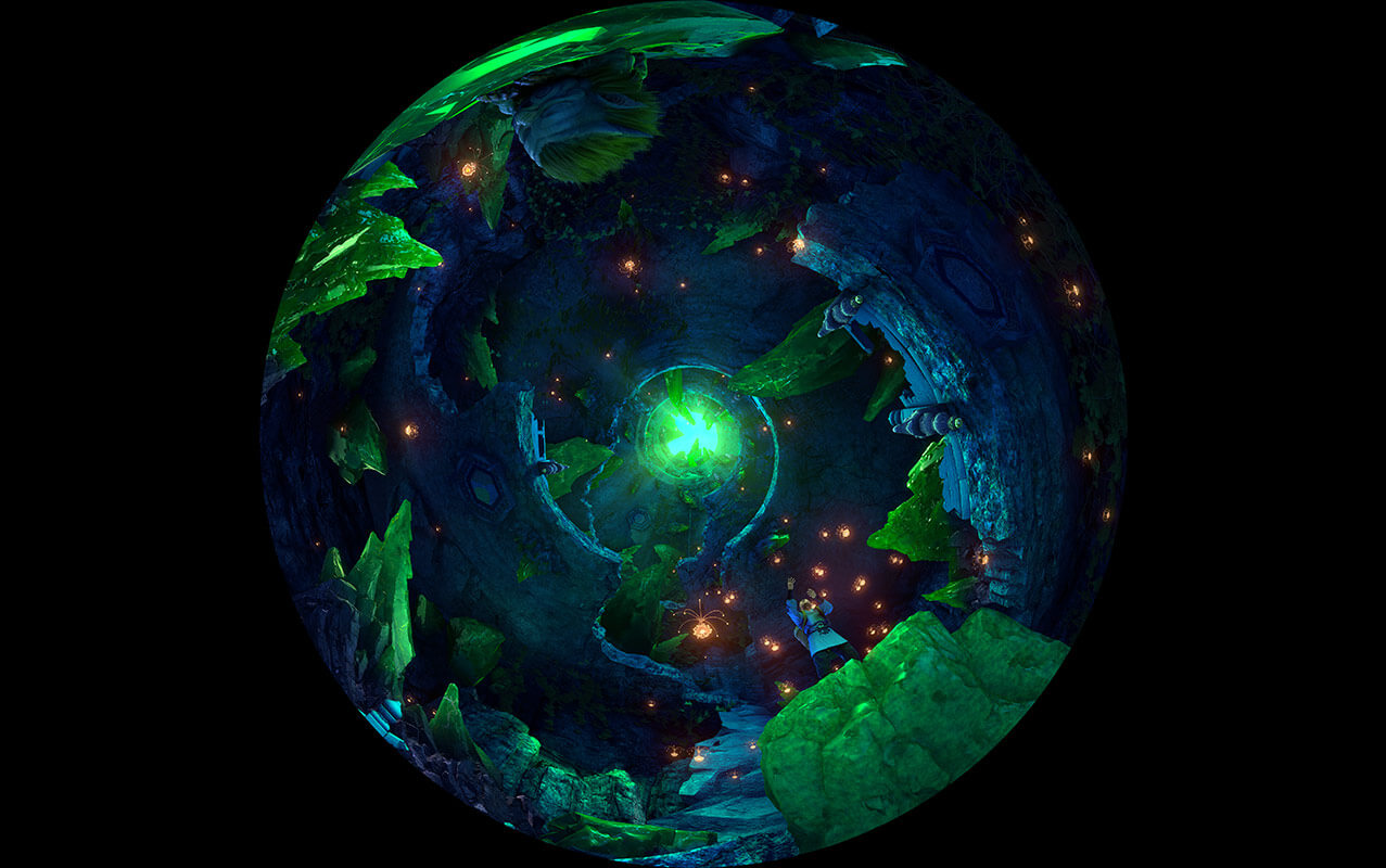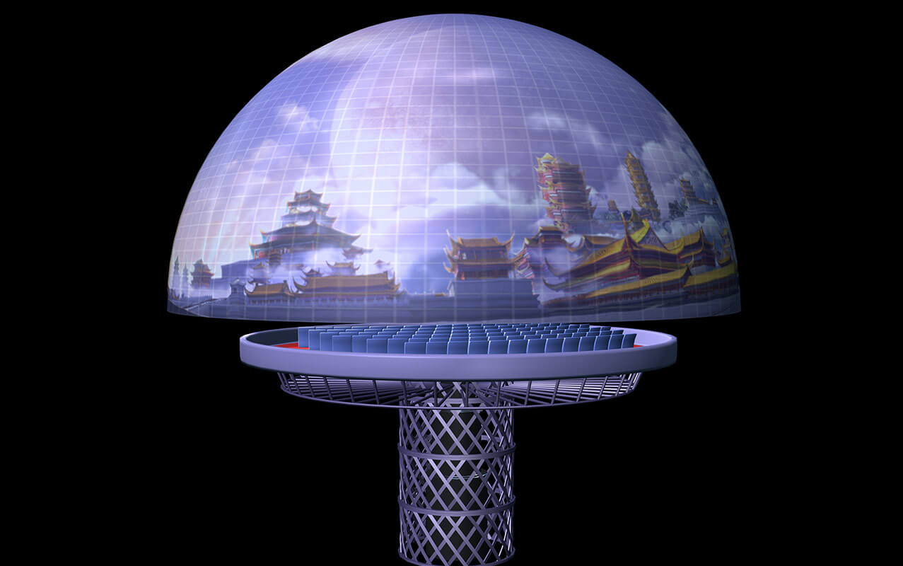 室內(nèi)升降式穹頂影院主演廳分為兩層,通過(guò)大型旋轉(zhuǎn)升降式平臺(tái)連接。一層為多媒體實(shí)景舞臺(tái),多種銀幕與實(shí)景相結(jié)合,二層為穹頂式球幕表演。根據(jù)劇情發(fā)展帶領(lǐng)觀眾乘坐超大型提升平臺(tái)從一層提升到9米高的二層觀影平臺(tái),結(jié)合多種高科技表現(xiàn)手段,創(chuàng)造出震撼的動(dòng)感體驗(yàn)。